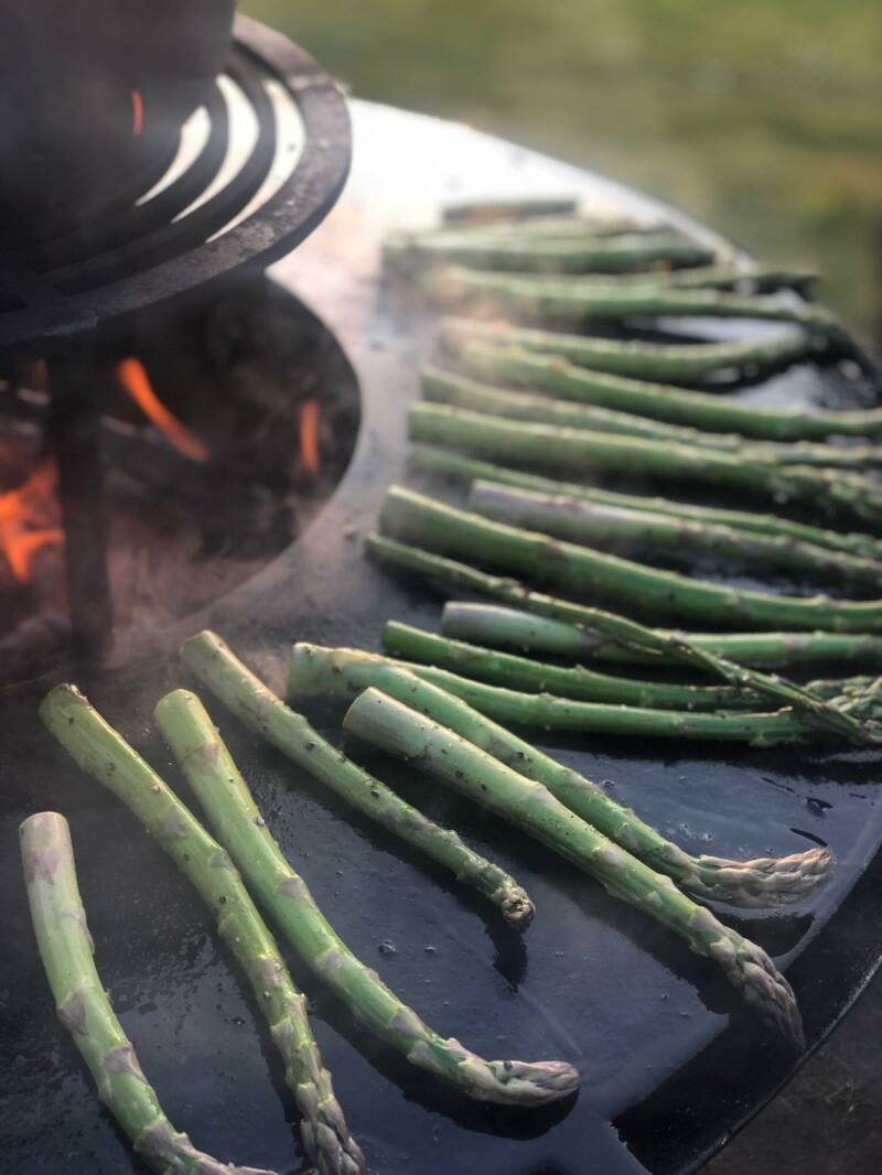 - Bak/grill de asperges gedurende ca. 8 minuten rondom en bestrooi tussendoor nog eens met olijfolie;